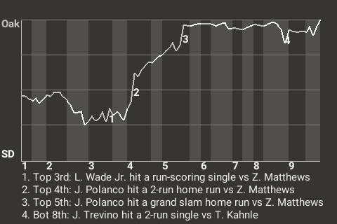 With Oakland leading 4-2 in the top of the fifth, Polanco hit a cutter from Zebby Matthews for a grand slam home run. It was his 11th home run of the season and put the Roses ahead, 8-2.
