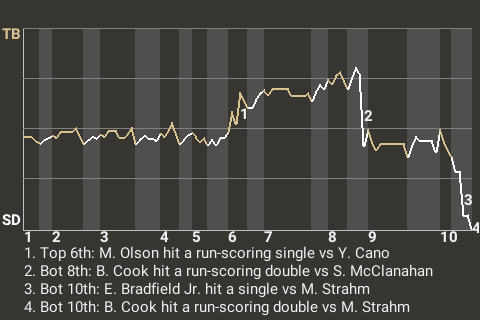 The decisive blow was delivered by Billy Cook in the bottom of the tenth when he hit a run-scoring double off 33-year old left-handed pitcher Matt Strahm to win the game for San Diego. The home crowd went nuts.