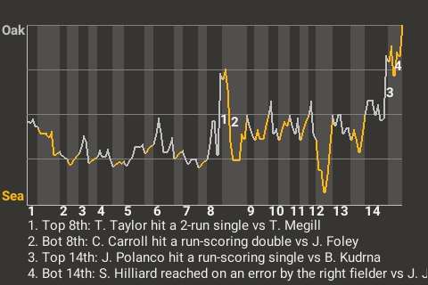 Jorge Polanco had a direct impact on the outcome. Polanco contributed a run-scoring single in the top of the 14th inning to put Oakland up, 4-3.