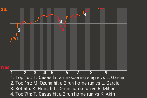 Marcell Ozuna had a big 2-run home run for the Sluggers in the top of the first inning. With St Louis leading 1-0 and a runner on 1st, he sized up a cutter from 28-year old right-handed pitcher Luis Garcia and punished it. The result was his 15th home run of the season, which put the Sluggers on top, 3-0.