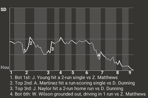 Houston parlayed a decent outing from starter Dane Dunning into a solid win over the San Diego Snakeyes. The final score was 6-4. Josh Sborz, credited with the save, is now 2 for 2 in save opportunities. The 4th-place Snakeyes have lost 4 straight games.