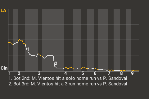 With Cincinnati leading 2-0 in the bottom of the third, Vientos hit a sinker from Patrick Sandoval for a 3-run home run. It was his 16th home run of the season and put the Stars ahead, 5-0.