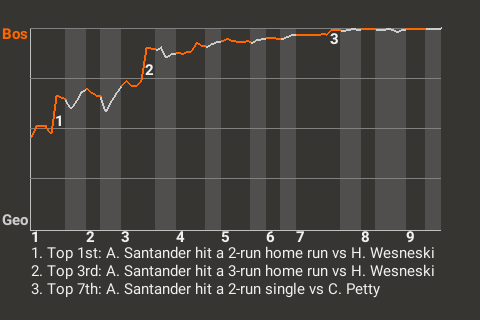 With Boston leading 2-0 in the top of the third, Santander hit a cutter from Hayden Wesneski for a 3-run home run. It was his 20th home run of the season and put the Minutemen ahead, 5-0.