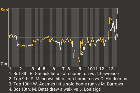 Seattle needed the clutch hitting of Willy Adames to seal the deal. The shortstop swatted a solo home run in the top of the 13th inning to put the Sting on top, 4-3. For the game, Adames had 1 home run and 1 single in 6 at-bats.