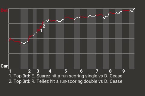 The Demons had to work out of trouble in the bottom of the seventh. The score was 3-0, Detroit, with no one out. Carolina, with a runner on 1st, was mounting a threat. Eric Haase dug in at the plate, but on a 2-2 changeup, he struck out.