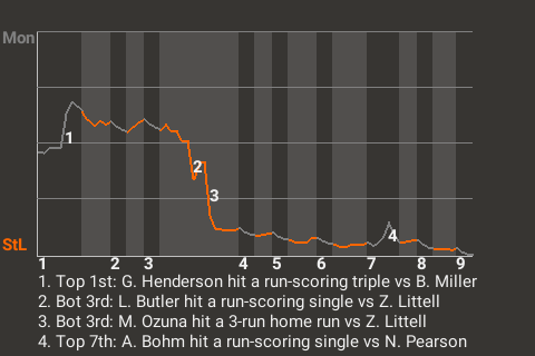The Sluggers got a big at-bat from designated hitter Marcell Ozuna. For the game, Ozuna went 1-4 with a home run. He drove in 3 runs and scored once. In the bottom of the third, with runners on 2nd and 3rd, he stroked a 3-run home run. His 18th home run of the season gave St Louis a 5-2 lead.