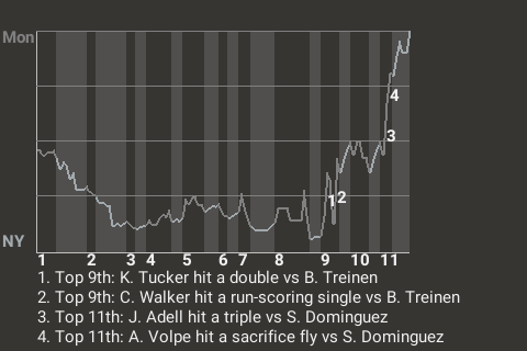 Anthony Volpe drew 1 walk in 6 plate appearances for Montreal. The 24-year old second baseman had a key at-bat in the top of the 11th. With one out and a runner on 3rd, he broke a 4-4 tie with a run-scoring sacrifice fly off Seranthony Dominguez. It was his 30th RBI of the season.