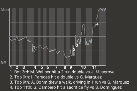 Gustavo Campero drove in one run for Montreal. The 27-year old left fielder had a key at-bat in the top of the 11th. With one out and runners on 1st and 3rd, he broke a 2-2 tie with a run-scoring sacrifice fly off Seranthony Dominguez. It was his 1st RBI of the season.