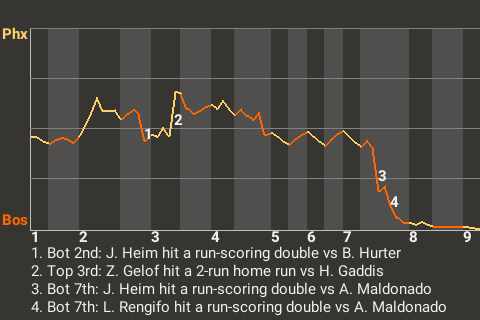 Boston took a 4-3 lead on Jonah Heim's 19th double of the season. The run-scoring double, which Heim hit in the bottom of the seventh, left Phoenix pitcher Anthony Maldonado visibly frustrated.