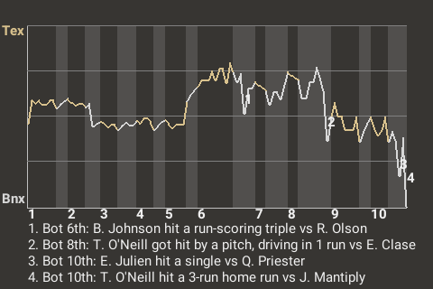 O'Neill dealt the big blow in the bottom of the tenth. That's when he launched a 3-run home run off Texas pitcher Joe Mantiply to win it for the Bombers.