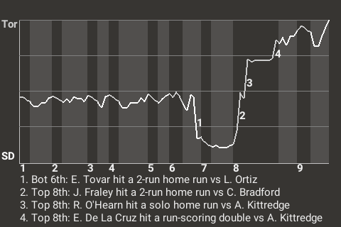 San Diego got a terrific performance from pitcher Cody Bradford, but it wasn't enough to beat the Toronto Hogs. Toronto won the Petco Park contest, 4-2. Bradford threw 7.1 innings of 2-hit ball for the losing team. Luis Ortiz was the winner. He's now 7-4. The loser was 35-year old right-handed pitcher Andrew Kittredge. Jesse Chavez was credited with the save. He has now successfully converted 1 of 5 save opportunities.