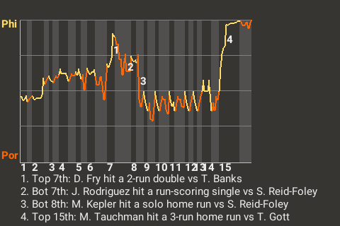 Mike Tauchman came through with a big-time hit for Philadelphia. The left fielder smacked a 3-run home run in the top of the 15th inning to give his team the lead, 6-3. It was his only hit, but it was clutch.