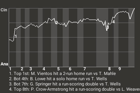 The Stars got a big at-bat from first baseman Mark Vientos. For the game, Vientos was 1 for 4 with a home run, while adding 2 RBI and scoring once. In the top of the first, with a runner on 1st, he stroked a 2-run home run. His 20th home run of the season gave Cincinnati a 2-0 lead.