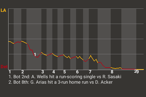 With Detroit leading 5-0 in the bottom of the eighth, Arias came up to bat against Los Angeles pitcher Dane Acker. Arias hit a changeup to left for a 3-run home run. His 12th home run of the season put the Demons on top, 8-0.