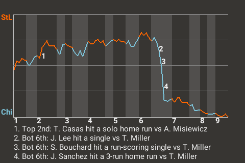 The Explorers got a big at-bat from right fielder Jesus Sanchez. For the game, Sanchez went 1 for 4 with a home run, while adding 3 RBI and scoring once. In the bottom of the sixth, with runners on 1st and 3rd, he stroked a 3-run home run. His 19th home run of the season gave Chicago a 4-2 lead.