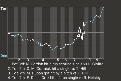 The Toronto Hogs converted a terrific effort from starter Lucas Giolito into a win over the Denver Bears at Coors Field. The Hogs won the game by a final score of 3-2. Reliever Jordan Hicks picked up the win. His record improves to 4-1. Tim Hill took the loss. Earning the save was Kenley Jansen. He's now cashed in 16 of 20 save opportunities.