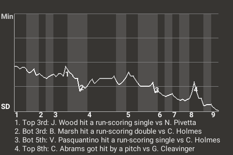 San Diego designated hitter Vinnie Pasquantino contributed a timely at-bat in the bottom of the fifth. With two down, he hit a sinker to right field for a run-scoring single. It was his 104th hit of the season and put the Snakeyes ahead, 4-2.