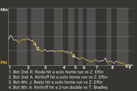 The Phalanx had to work out of trouble in the top of the seventh. The score was 3-0, Philadelphia, with two out. Minnesota, with the bases loaded, was mounting a threat. Miguel Amaya dug in at the plate, but on a 1-0 slider, he grounded out.