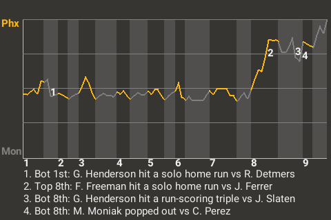 Phoenix took a 3-1 lead on Freddie Freeman's 16th home run of the season. The solo home run, which Freeman hit in the top of the eighth, left Montreal pitcher Jose A Ferrer visibly frustrated.