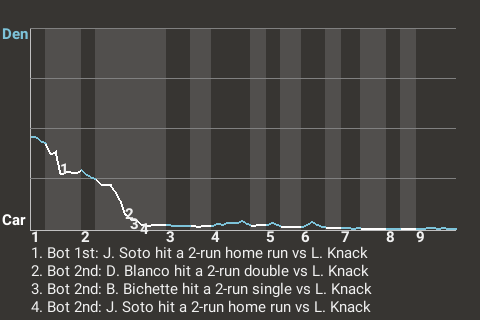 Due in large part to right fielder Juan Soto, the Carolina Riptides sunk the Denver Bears, 8-3. Soto hit 2 home runs, while adding 4 RBI and scoring twice. With the win, Carolina pushed its record to 53-49.