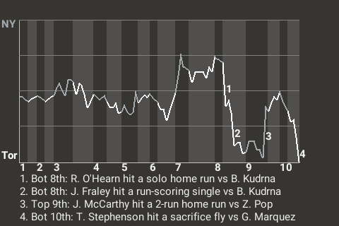 The clutch at-bat came in the bottom of the tenth inning, when Toronto pinch hitter Tyler Stephenson, facing German Marquez, had a run-scoring sacrifice fly. It gave the Hogs the 6-5 win.