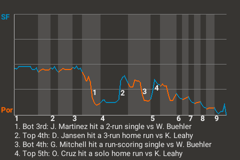 J.D. Martinez went 1 for 3 with a walk, while adding 2 RBI and scoring once for Portland. The 37-year old left fielder had a key at-bat in the bottom of the third. With one out and the bases loaded, he broke a 0-0 tie with a 2-run single off Walker Buehler. It was his 15th hit of the season.