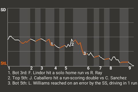 Francisco Lindor, who is tied for 5th in the FL in runs scored with 73, took San Diego hurler Robbie Ray deep in the bottom of the third. His solo home run put the Sluggers on top, 1-0. In all, Lindor had 1 single in addition to the home run, while going 2 for 4.