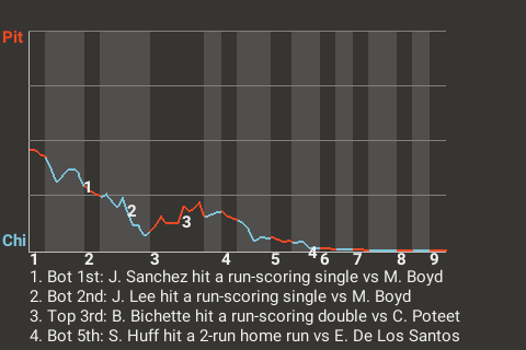 Jung-hoo Lee led Chicago to a win over Pittsburgh. The final score was 10-2. Lee scored 3 times, going 3 for 5. He also knocked in 2 RBI. The winner was Cody Poteet, who threw 88 pitches over 5 innings. The right-hander was charged with 2 runs on 4 hits. This loss makes it 7 in a row for Pittsburgh.