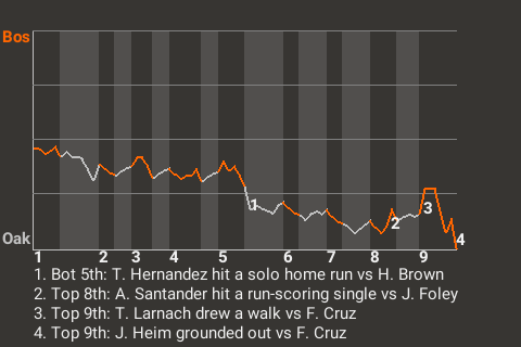 Teoscar Hernandez chipped in a solo home run for Oakland in the bottom of the fifth. For the game, the designated hitter had 2 hits in 3 at-bats with 1 home run, 1 single, 1 run scored, and 1 RBI.