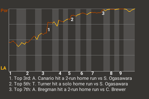 With Portland leading 1-0 in the top of the third, Canario hit a curveball from Shinnosuke Ogasawara for a 2-run home run. It was his 7th home run of the season and put the Jaguars ahead, 3-0.
