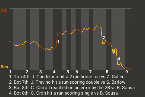The game was at a stalemate until pinch hitter C.J. Cron came to bat in the bottom of the eighth. Facing St Louis pitcher Bennett Sousa, he hit a first pitch fastball for a run-scoring single. It was a game-changer, putting Seattle on top, 3-2.