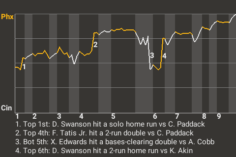 Dansby Swanson impressed in the 5-3 Phoenix win over Cincinnati. Swanson hit 2 home runs. He drove in 3 runs and scored twice. The winning pitcher was 37-year old right-handed pitcher Alex Cobb. He tossed 91 pitches over 6 innings, allowing 3 runs on 7 hits. D.L. Hall recorded the save, making him 3 for 3.