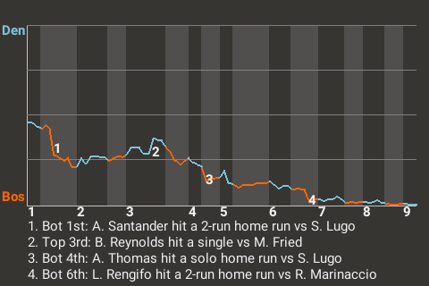 Early in the game, Santander had a 2-run home run for Boston. It was his 30th home run of the season and put the Minutemen on top, 2-0.