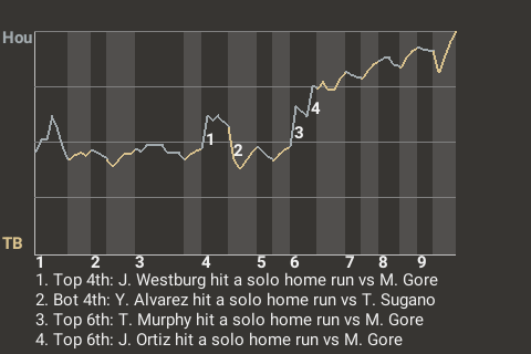 The Titans got a big at-bat from catcher Tom Murphy. For the game, Murphy went 1 for 4 with a home run. In the top of the sixth, with the bases empty, he stroked a solo home run. His 11th home run of the season gave Houston a 2-1 lead.