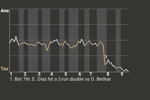 Texas took a 2-0 lead on Elias Diaz's 9th double of the season. The 2-run double, which Diaz hit in the bottom of the seventh, left Anaheim pitcher David Bednar visibly frustrated.