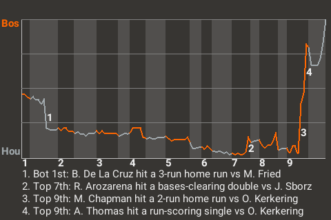 The game was at a stalemate until center fielder Alek Thomas came to bat in the top of the ninth. Facing Houston pitcher Orion Kerkering, he hit a first pitch changeup for a run-scoring single. It was a game-changer, putting Boston on top, 6-5.