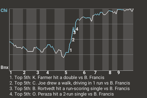 Oswald Peraza went 1 for 5. He drove in 2 runs for Chicago. The 25-year old second baseman had a key at-bat in the top of the fifth. With one out and the bases loaded, he broke a 2-2 tie with a 2-run single off Bowden Francis. It was his 122nd hit of the season.