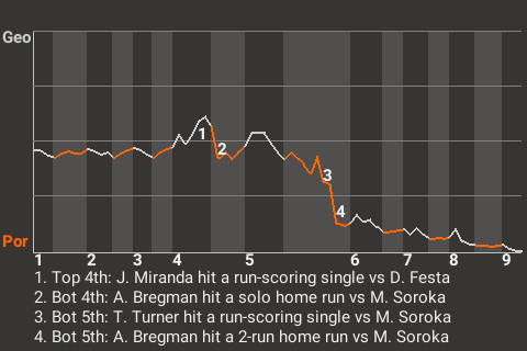 With Portland leading 2-1 in the bottom of the fifth, Bregman hit a fastball from Mike Soroka for a 2-run home run. It was his 34th home run of the season and put the Jaguars ahead, 4-1.