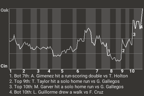 Mitch Garver came through with a big-time hit for Oakland. The catcher smacked a solo home run in the top of the tenth inning to give his team the lead, 5-4. It was his only hit, but it was clutch.