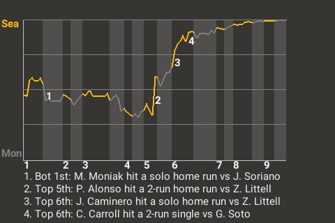 With Seattle trailing 2-1 in the top of the fifth, Alonso hit a slider from Zack Littell for a 2-run home run. It was his 35th home run of the season and put the Sting ahead, 3-2.