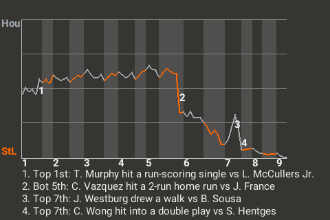 The Sluggers got a big at-bat from catcher Christian Vazquez. For the game, Vazquez was 1 for 3 with a home run. He drove in 2 runs and scored once. In the bottom of the fifth, with a runner on 2nd, he stroked a 2-run home run. His 8th home run of the season gave St Louis a 2-1 lead.