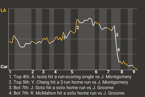 Juan Soto, who finished 2nd in the UL in home runs with 44 in 2020, helped out the Carolina cause in the bottom of the seventh inning with a solo home run. For the game, the designated hitter was 1 for 2 with a home run and 2 walks.