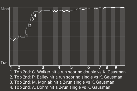 With Montreal leading 1-0 in the top of the second, Bailey hit a run-scoring single off Toronto hurler Kevin Gausman. It was the 89th hit of the season for Bailey and put his team ahead, 2-0.
