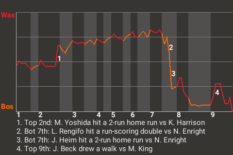 Boston took a 3-2 lead on Jonah Heim's 14th home run of the season. The 2-run home run, which Heim hit in the bottom of the seventh, left Washington pitcher Nic Enright visibly frustrated.