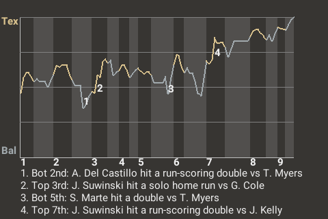 Texas took a 4-2 lead on Suwinski's 15th double of the season. The run-scoring double, which he hit off Joe Kelly in the top of the seventh, propelled Texas to the win.