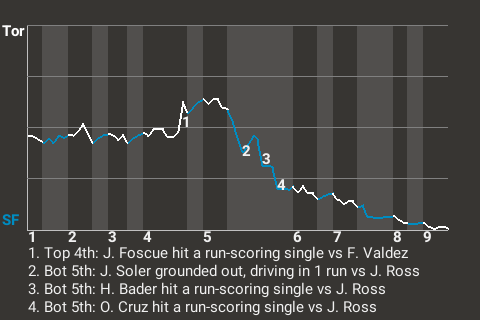 San Francisco shortstop Oneil Cruz contributed a timely at-bat in the bottom of the fifth. With two down, he hit a fastball to left field for a run-scoring single. It was his 136th hit of the season and put the Dragons ahead, 3-1.