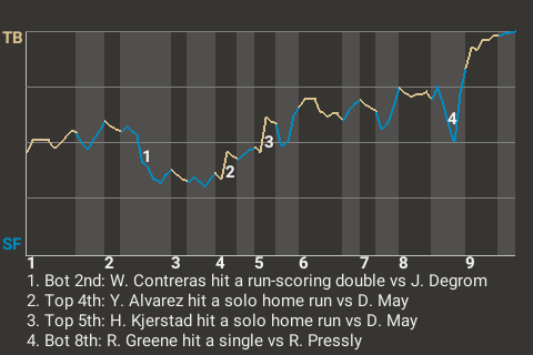 2 (15, 5th Inning off D. May, 0 on, 1 out; 9th Inning off B. Wilson, 0 on, 2 outs)