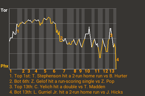 The decisive blow was delivered by Lourdes Gurriel Jr. in the bottom of the 13th when he hit a 2-run home run off 29-year old right-handed pitcher Jordan Hicks to win the game for Phoenix. The home crowd went nuts.