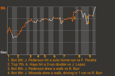 St Louis relied on the bat of Austin Hays to get the win. The left fielder ripped a 2-run double in the top of the seventh inning to put the Sluggers ahead, 5-2. For the game, Hays had 1 double and 1 triple in 5 at-bats.