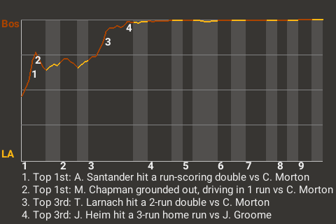 With Boston leading 6-0 in the top of the third, Heim came up to bat against Los Angeles pitcher Jay Groome. Heim hit a curveball to right for a 3-run home run. His 16th home run of the season put the Minutemen on top, 9-0.